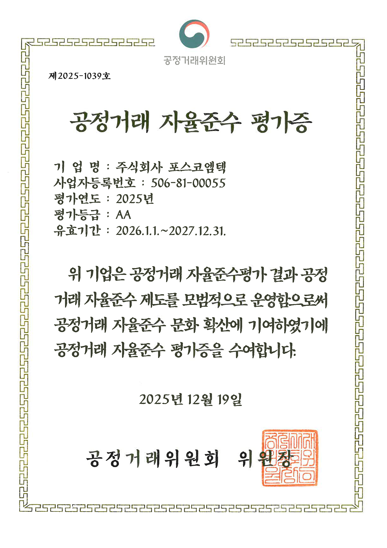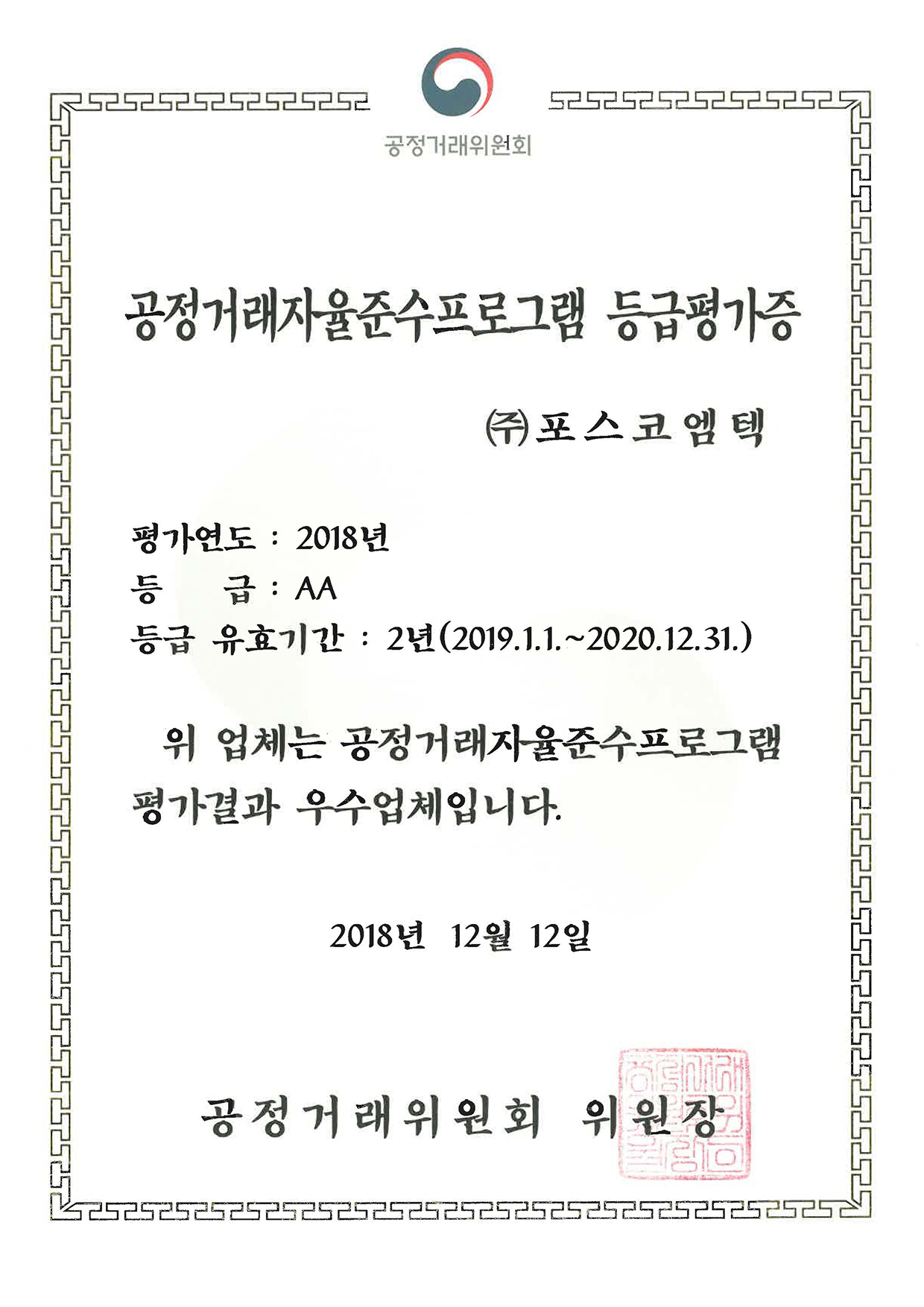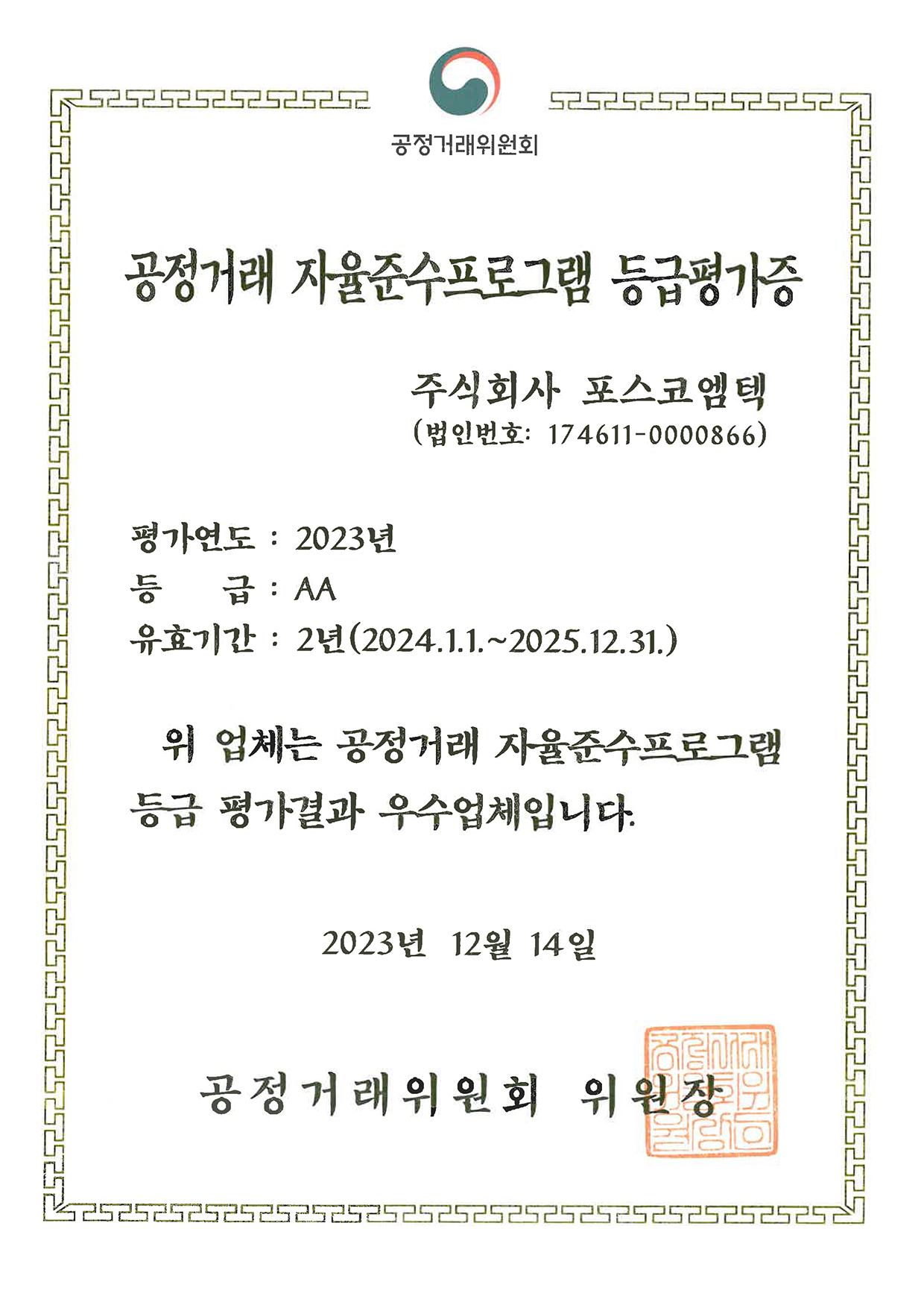 공정거래 자율준수 평가증 발급기관 공정거래위원회 포상일 2025.12.19 공정거래 자율준수프로그램 등급평가증 발급기관 공정거래위원회 포상일 2023.12.14 공정거래 자율준수프로그램 등급평가증 발급기관 공정거래위원회 포상일 2018.12.12